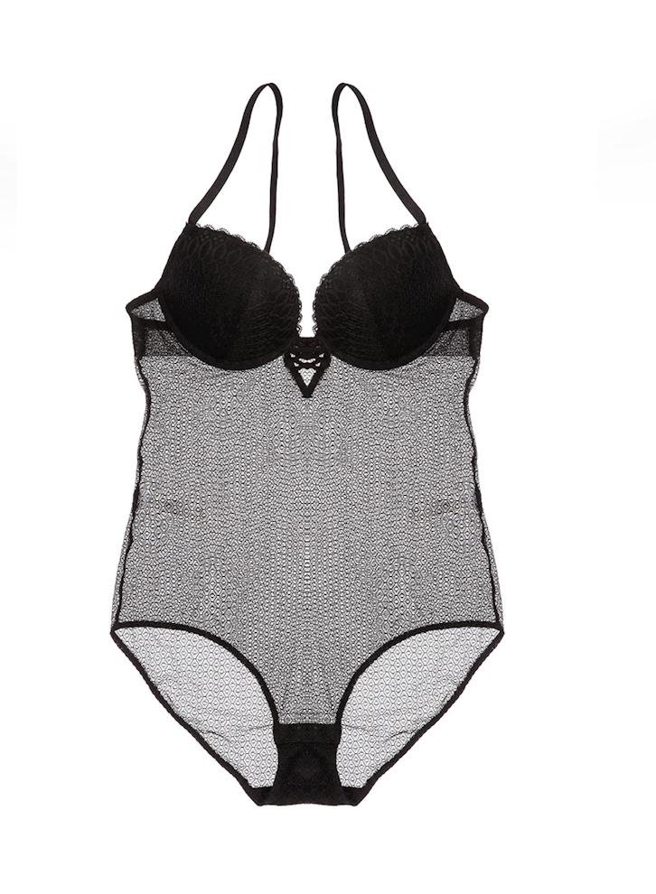 Nuestro exclusivo body Joyce, con sujetador push-up de media copa y tirantes cruzados con puente en V, te dará la silueta más favorecedora en un diseño refinado que combina encaje y malla.